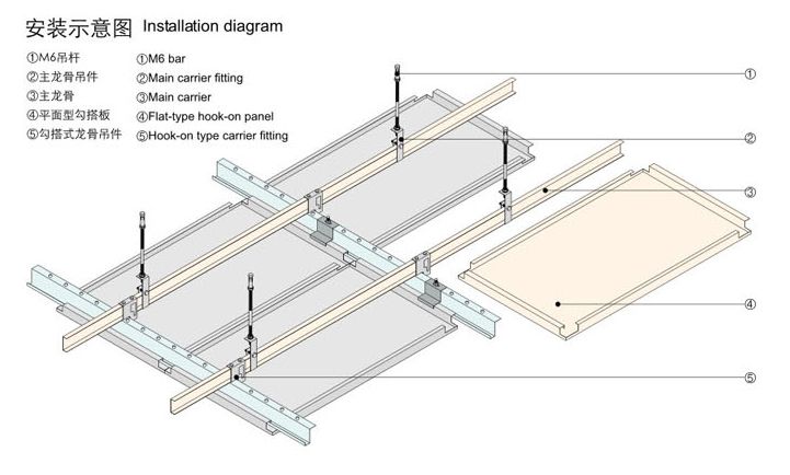 勾搭式天花,根据实际空间的需要,灵活设计天花板面的尺寸,固定龙骨系统后,可选手装卸,不需要任何辅助工具,灵活简易,龙骨系统配有防风码结构,其功能可以在暴风气候下,结构牢固,适合设计成各种装饰效果及形状,被广泛应用于天花活动性能要求较高的场所